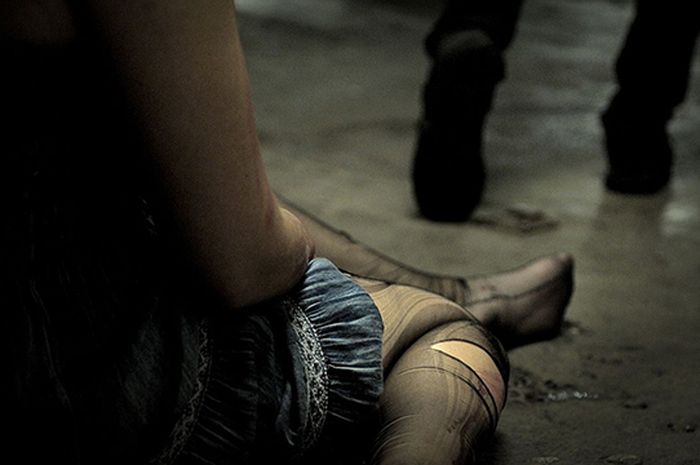 Potret itu menunjukkan seorang TKW duduk di trotoar memandangi orang-orang yang tengah makan di restoran.